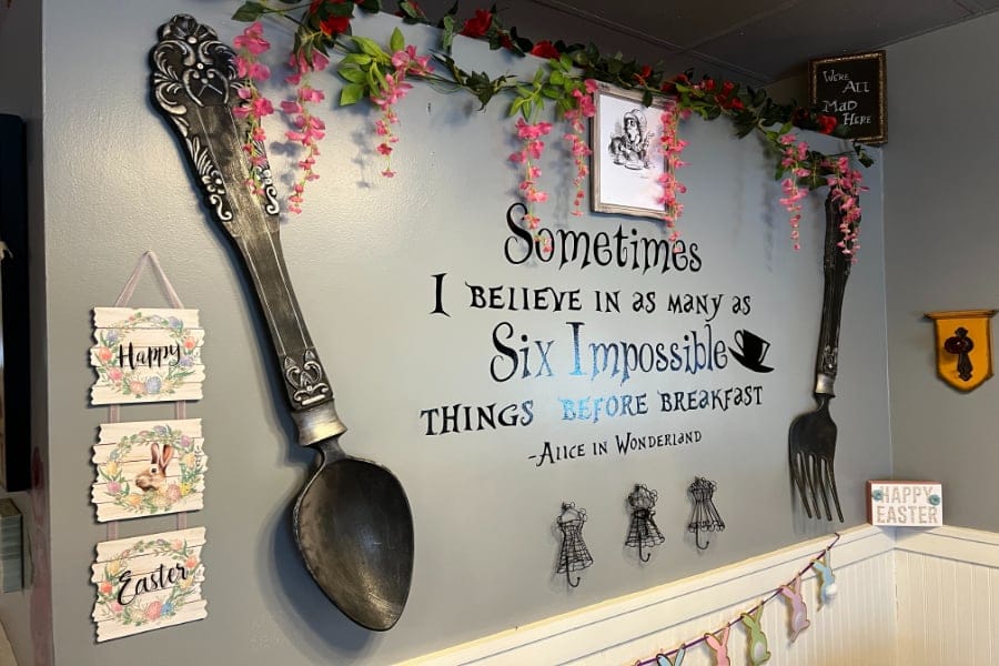 She found her home base at 154 Montauk Highway in Blue Point, right next door to Hot Chicken Mama — opening the Mad Batter Tea Room and Café in February. McKernan has since guided her patrons down the rabbit hole into her Alice in Wonderland inspired Victorian era tea room beyond the bar area at the front of house.