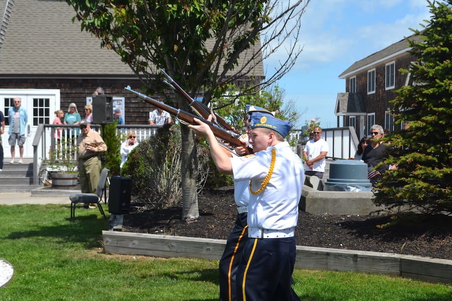 Fire Islanders and tourists watched as representatives of the Veteran’s American Legion, the United States Coast Guard, American Legion’s Joseph Loeffler Post 1006 of Brentwood and 92-year-old Don Robbins marched from the firehouse down the sandy paths to the center of town outside the Community House.