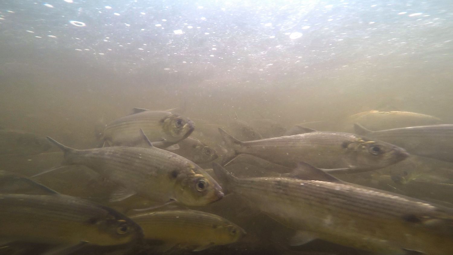 When a waterproof camera is dipped below the quick moving water, a whole new world is revealed. River herring, numbering in the hundreds, are swimming orderly against the current, compelled by the forces of nature to continue their journey despite the blockade before them.