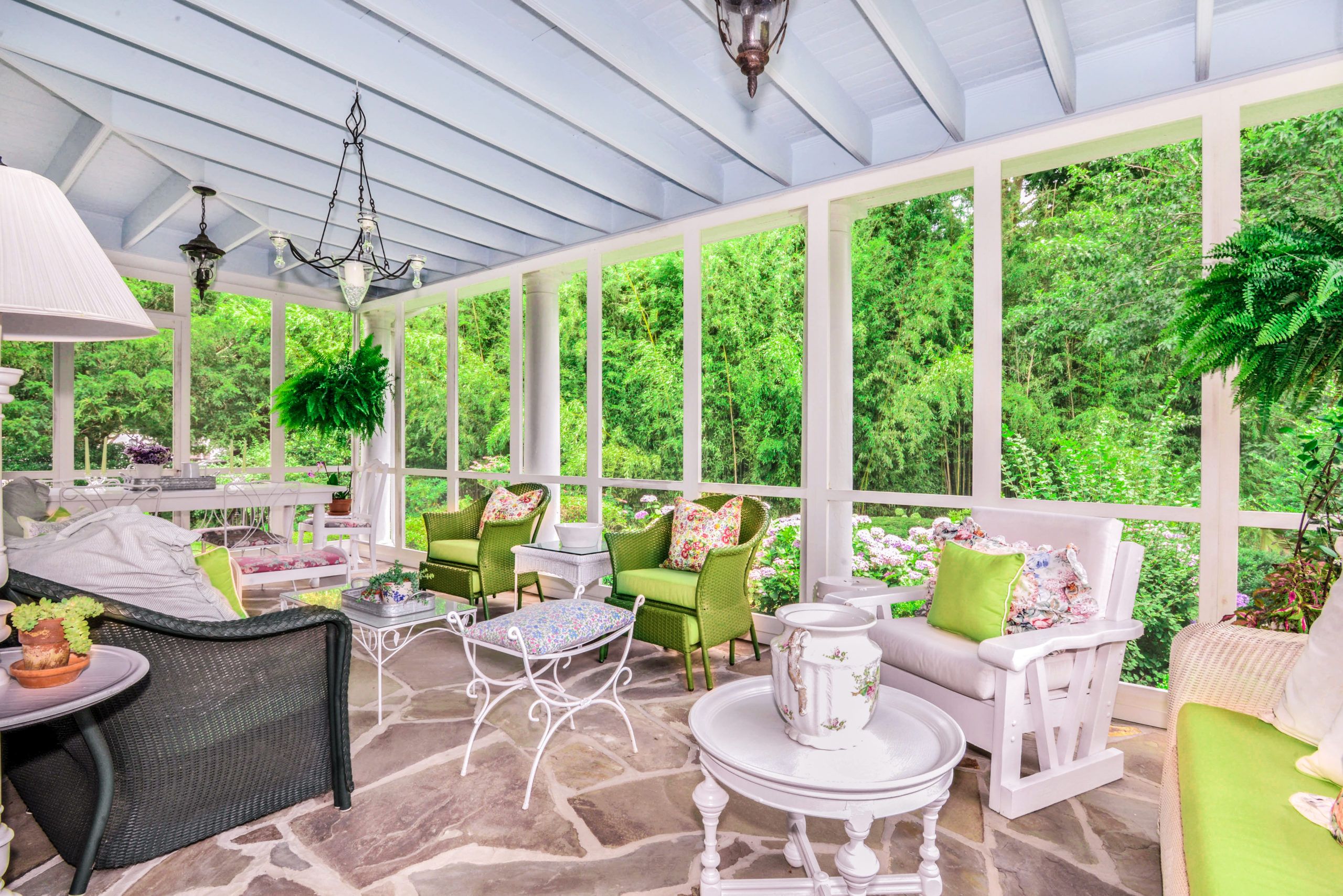 Double sets of French doors lead out to a screened in porch with slate floor, so you could sip your morning coffee alone and bird-watch, or chat with guests while you’re surrounded by the gardens.