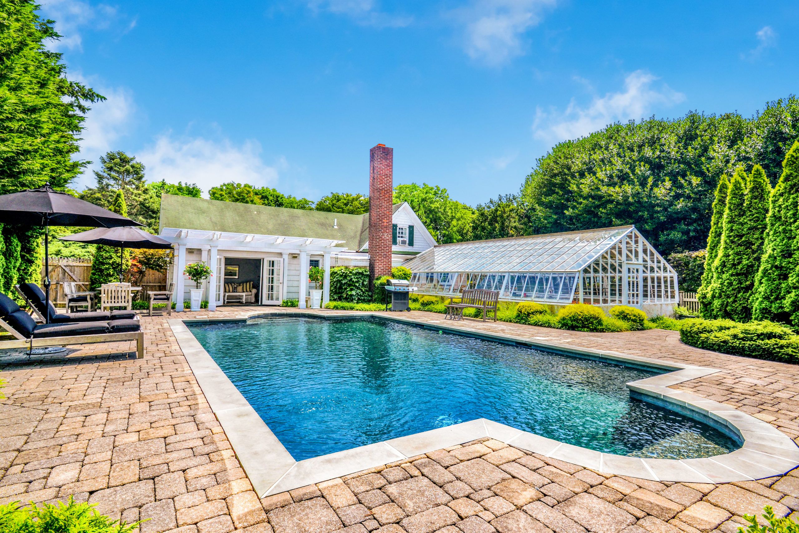 There’s also a modern kitchen and large, formal dining room. And behind the main house is a neat guest/pool house, as well as a fully functional Burnham greenhouse.