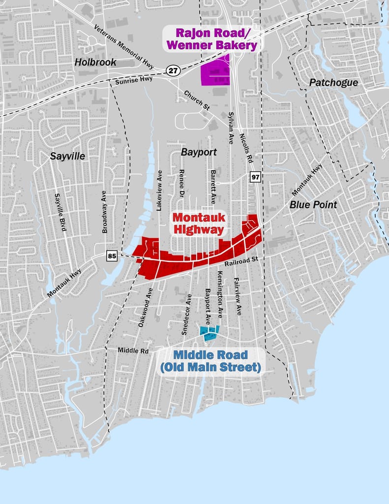 The Town of Islip is conducting a land use and zoning study for three distinct areas in Bayport, including Montauk Highway, Middle Road (Bayport’s Historic Hamlet Center), and an industrial area located on Rajon Road currently occupied by Wenner Bakery.