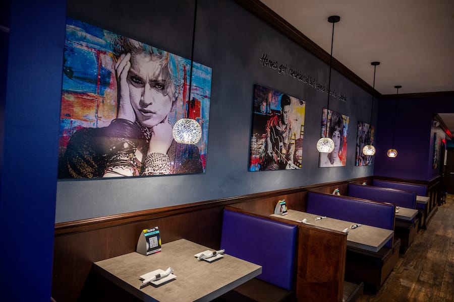 As far as the décor goes, portraits of an array of musicians and cultural icons — from Aretha Franklin and Marilyn Monroe to Madonna and Notorious B.I.G. — line the dining room walls.
