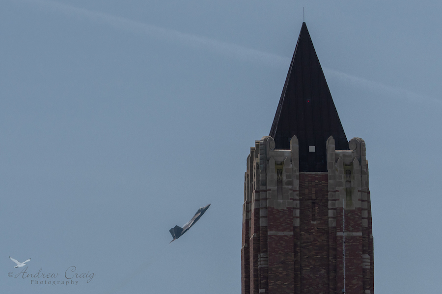 An F22 Raptor on the rise out beyond the Jones Beach Water Tower