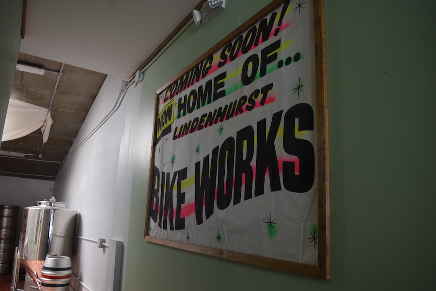 The sign of Bike Works that hung in the window of the now brewery.