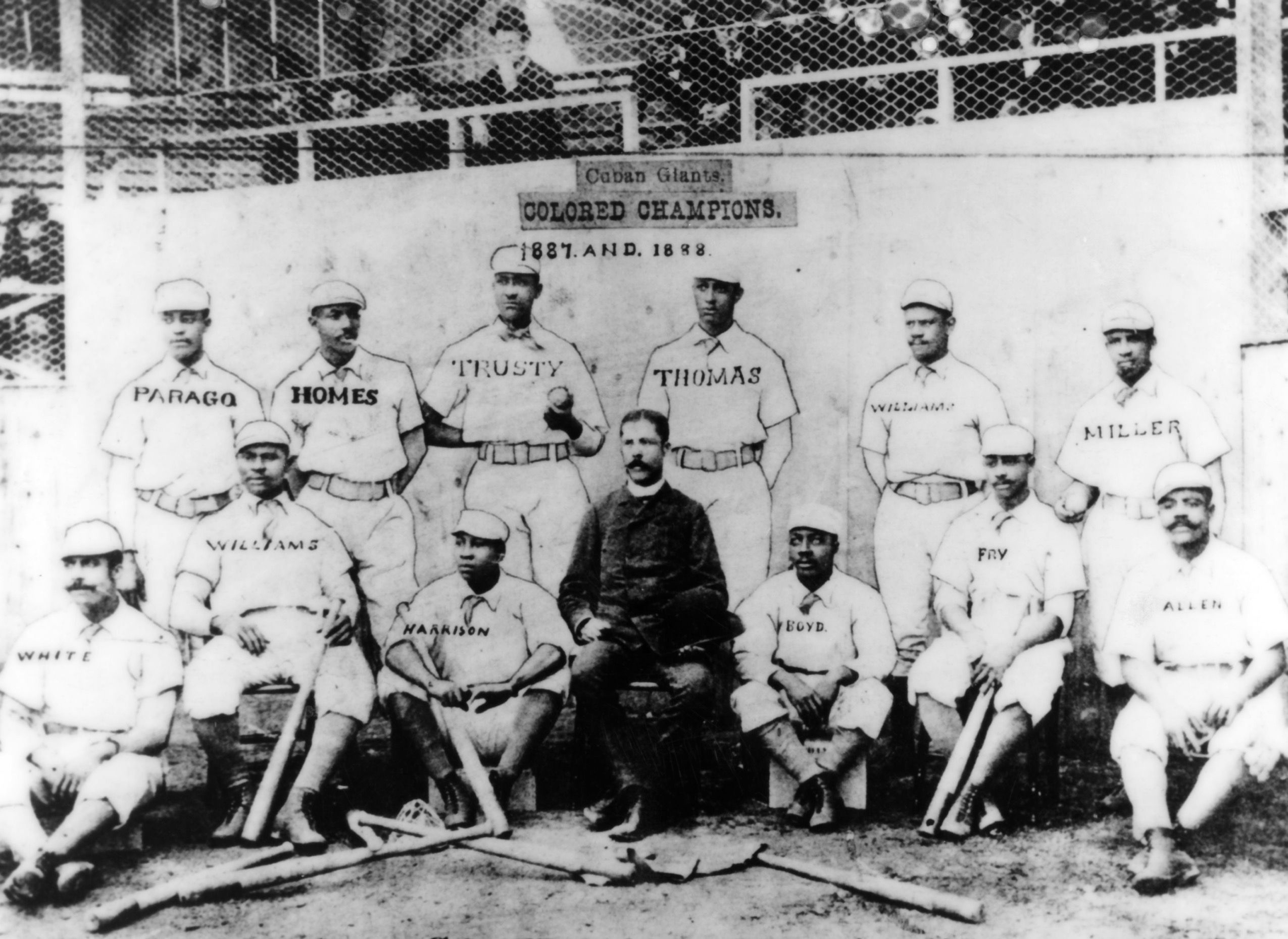 The team picture of the Cuban Giants is as followed: From left to right, standing in the back, George Parago, Ben Holmes, Shep Trusty, Arthur Thomas, Clarence Williams and Frank Miller. The front row, left to right, Sol White, George Williams, Abe Harrison, Manger S.K. Govern, Ben Boyd, Jack fry and Allen (first name unknown).