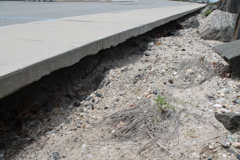 On the east terminus of the beach parking lot, storms have ripped into the lot and sidewalk — causing severe damage this past winter.