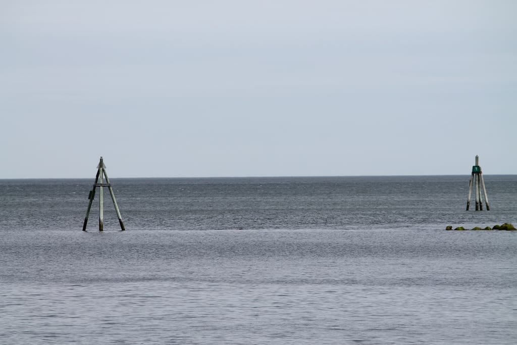 At high tide the jetty wall sinks beneath the water. Even with the wood dolphins marking the end of the harbor, high tide can cause a problem if an errant boater mistakenly runs aground traversing into the harbor where they think the rocks end.