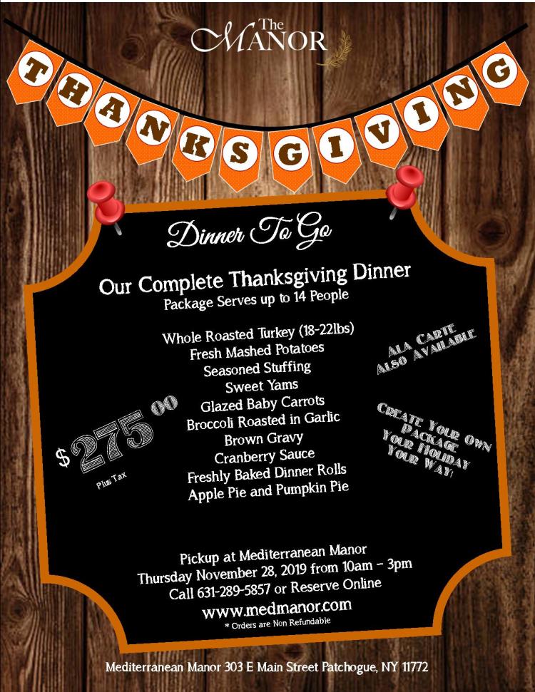 You can pick up your spread at The Manor anytime between 10 a.m. and 3 p.m. on Thanksgiving Day. See the below flyer for additional details.