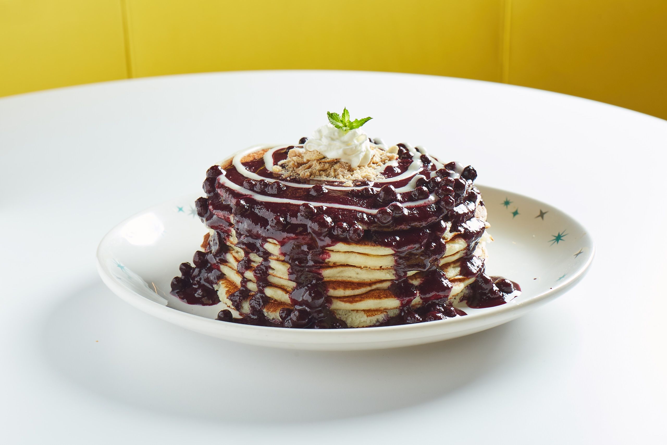 Buttermilk pancakes with zesty lemon cream cheese filling, topped with fresh blueberry compote, sweet cream and toasted almond streusel