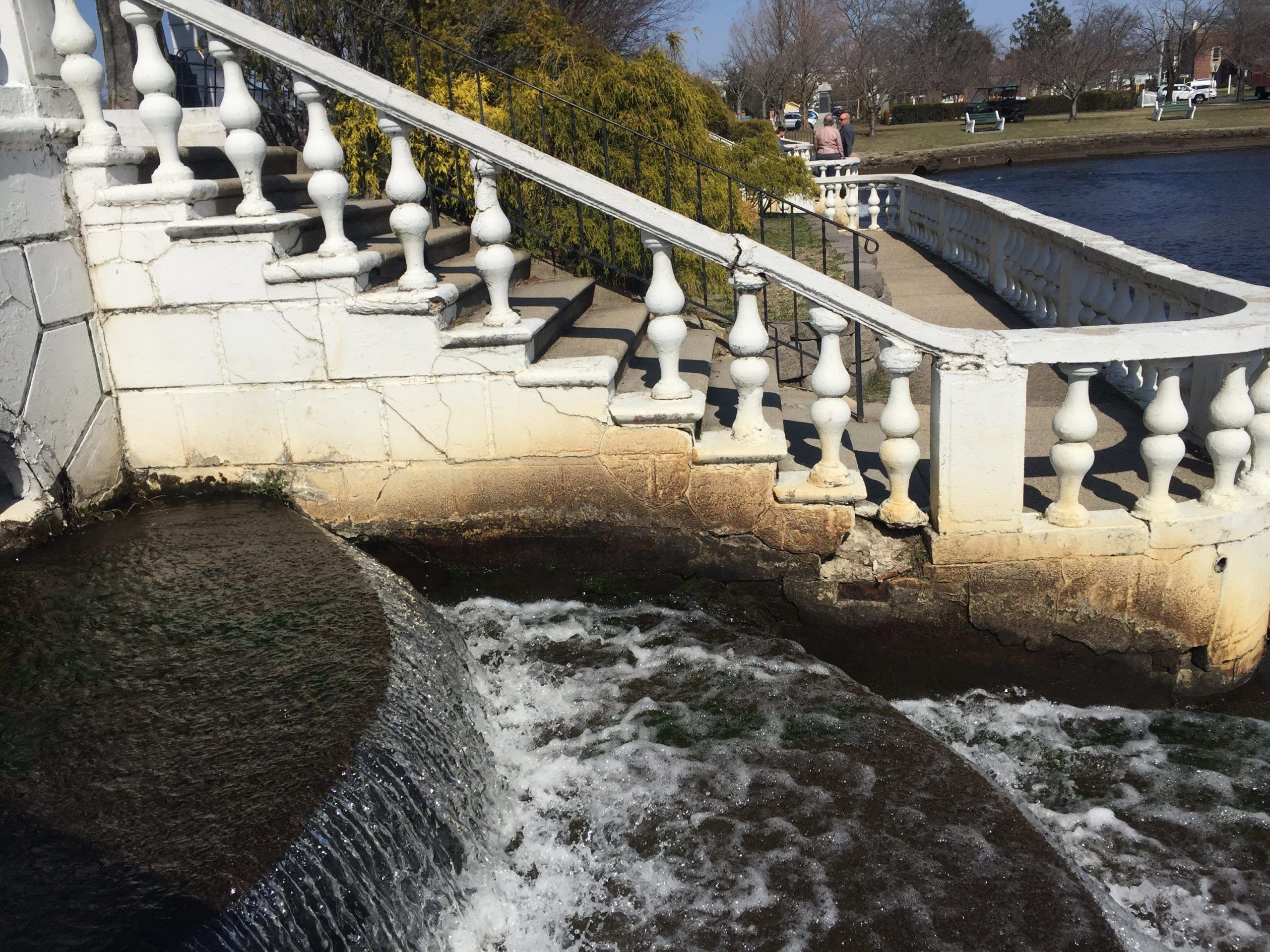 The railings and spindles will all need to be removed and either replaced or sanded down and repainted, the walls across the front of the falls need to be cleaned up, as well as the stairways leading up to each side of the falls. A standing ledge will also have to be repaired.