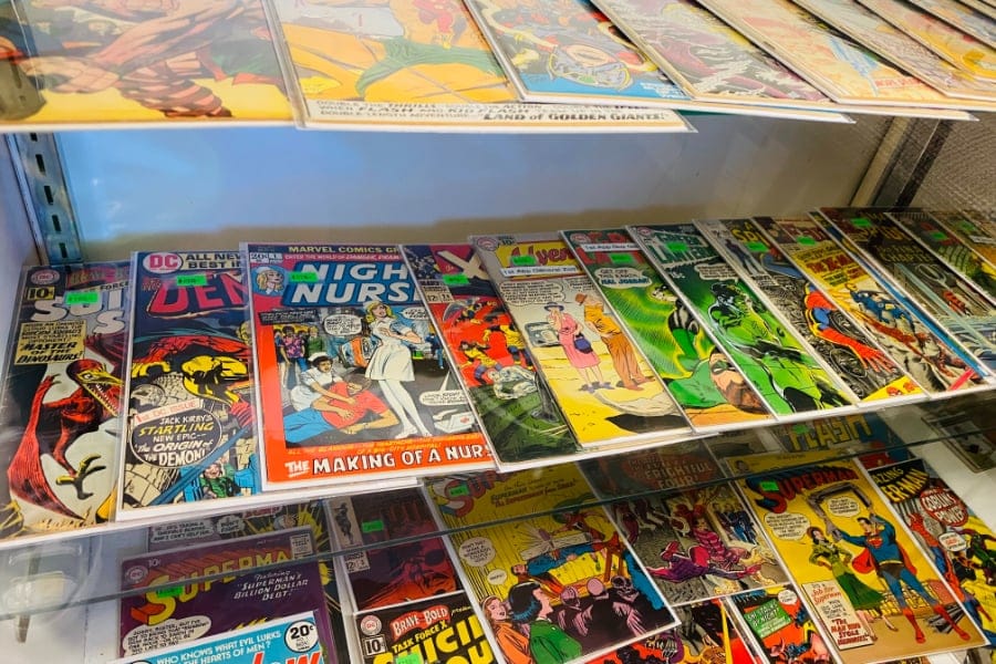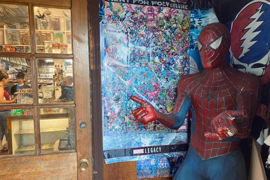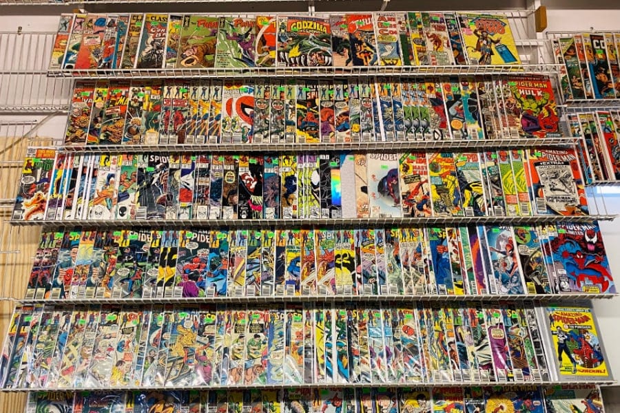 Nearly every wall of the shop is plastered with brightly colored Batman, Flash, Spiderman, Wonder Woman and other issues from the mid ’50s through 1970, with some bronze age issues, running through the mid 80’s, on display as well.