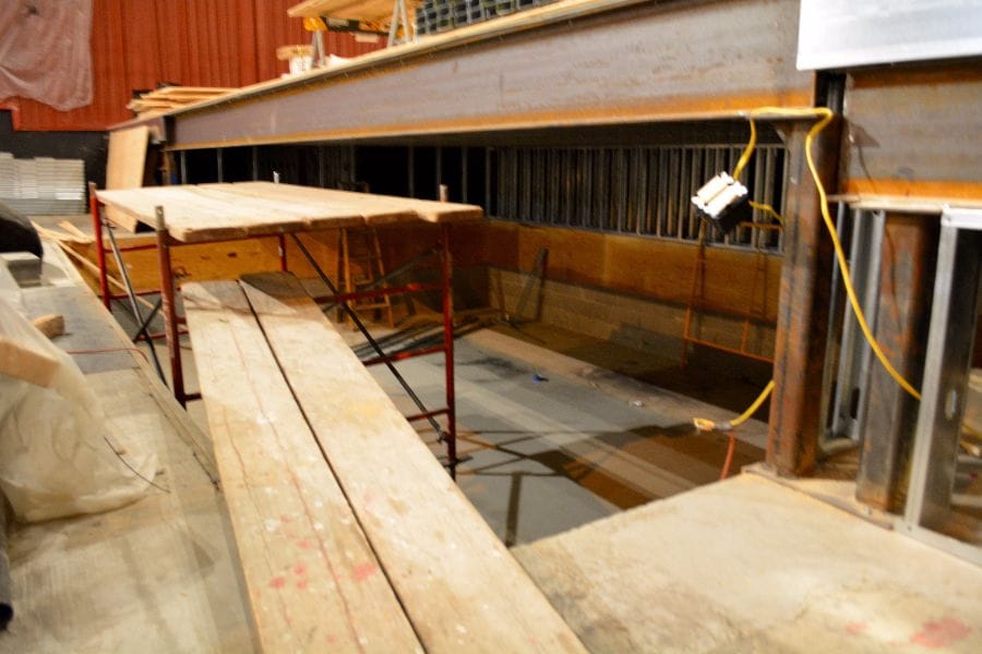 Tom Till of T&M Theatre Construction, who is overseeing the extensive renovation project, said shoring up the stage structure took much longer than expected. The rear of the stage is also holding up two floors for dressing rooms and a third floor for storage space. The framing for that interior structure went up last week. (More photos below.)