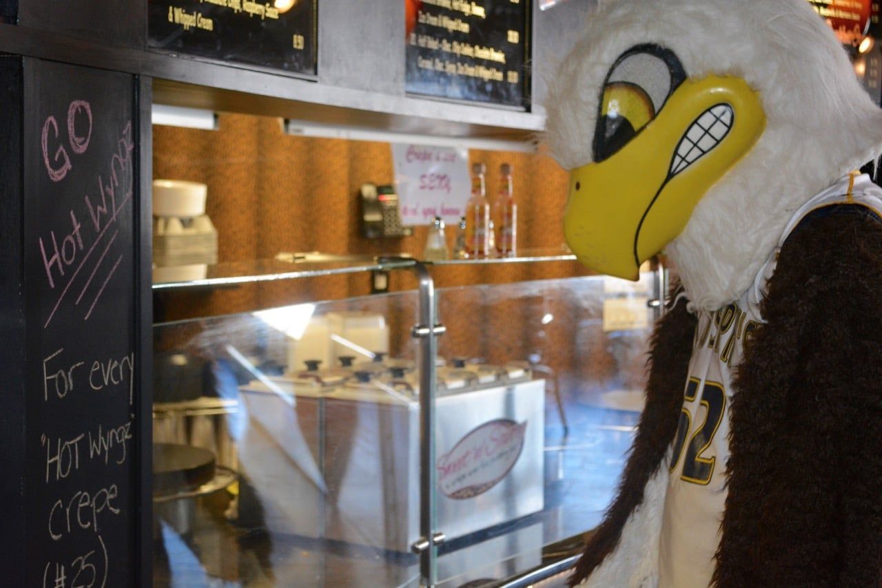 To kick off the initiative, they sent the school’s mascot, “Hot Wyngz,” across Waverly Avenue on Thursday to the closest participating restaurant, Sweet ‘n’ Savory, for a crepe and a bottle of Evian water.