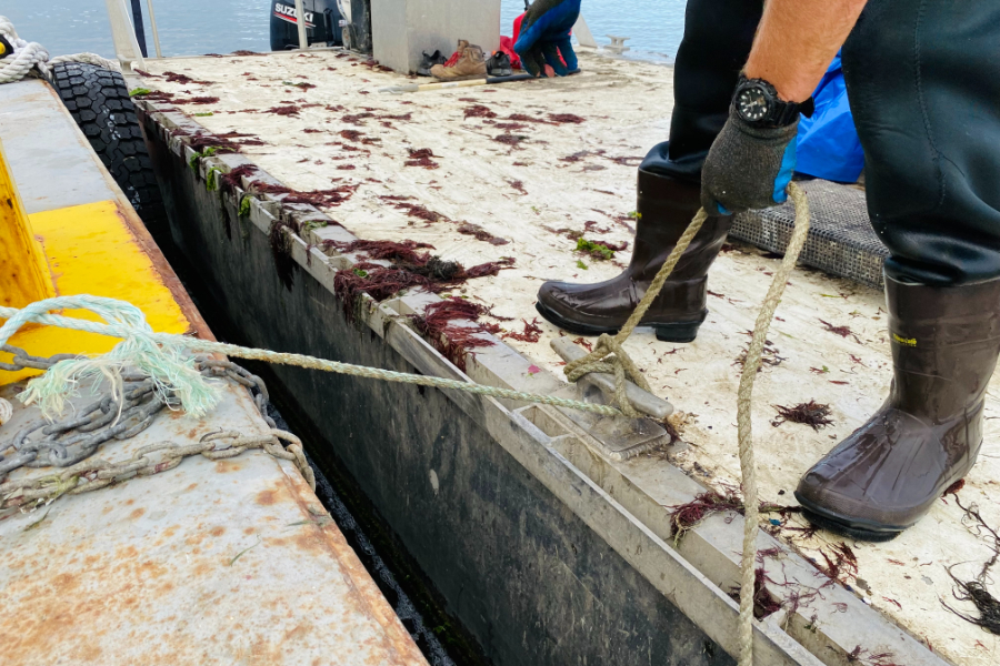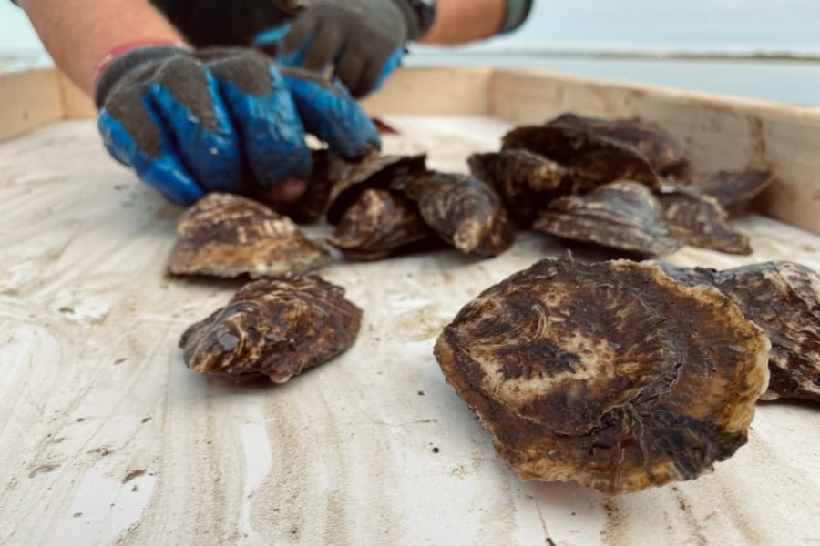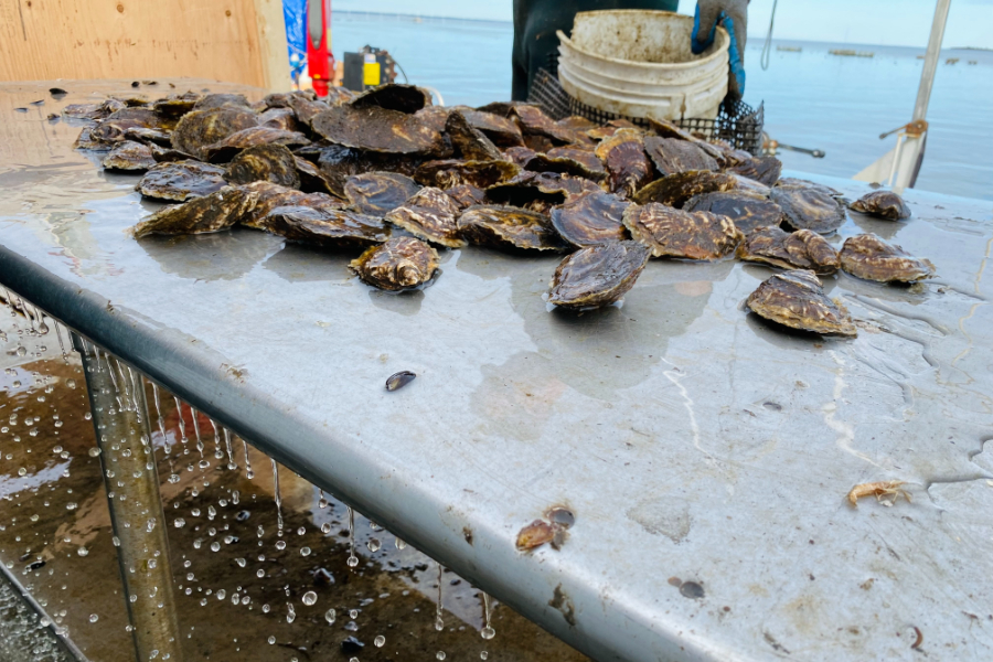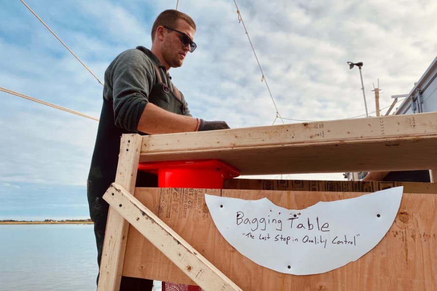 Before their day wrapped, Doutney and Casillas hopped on the barge to sort Doutney’s personal oysters to sell to a distributor the next day.