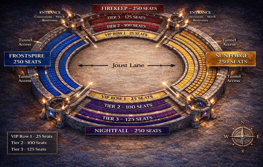 Stormridge Castle would be designed as a live, interactive medieval dinner show where guests don’t just watch — they participate.