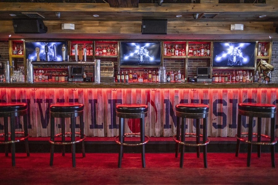 The Southern-inspired country club offers a honky-tonk atmosphere with its rustic decor, Down South-influenced cocktail and food menus, and its country tunes playing throughout the bar.