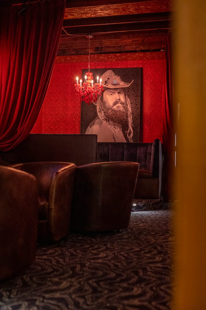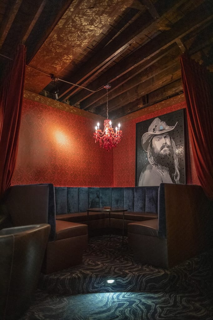 Hence the booth seating lined with velvet material, the massive painting of legendary singer Johnny Cash on a brick wall, and a dedicated area for live musical acts.