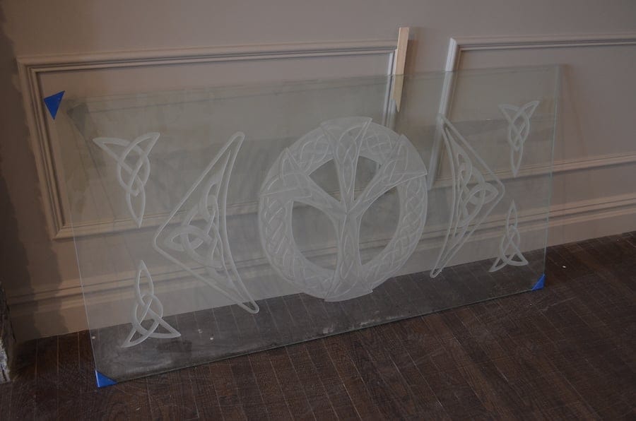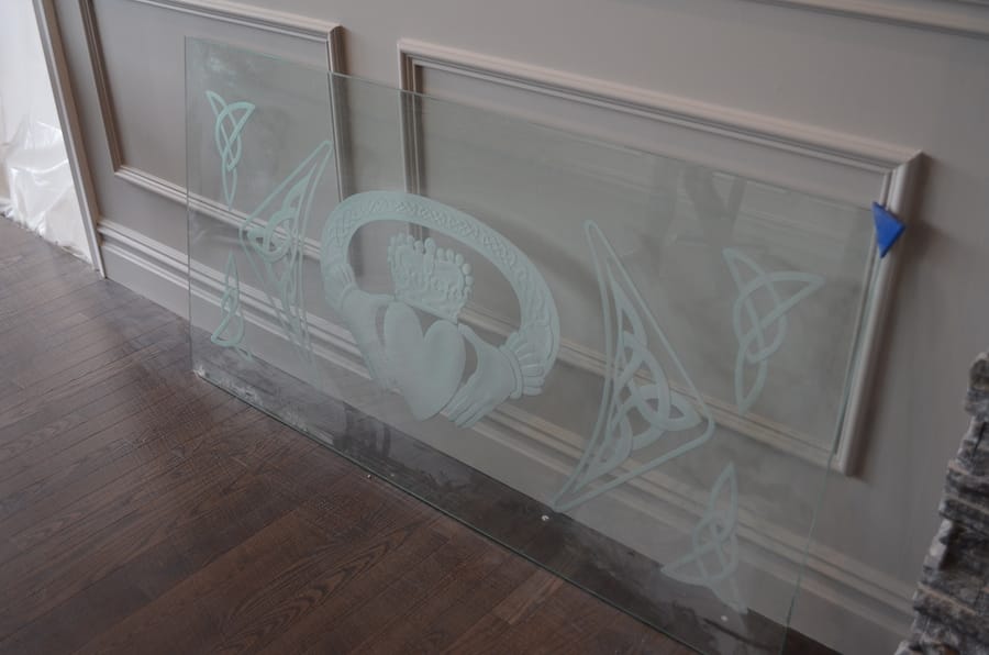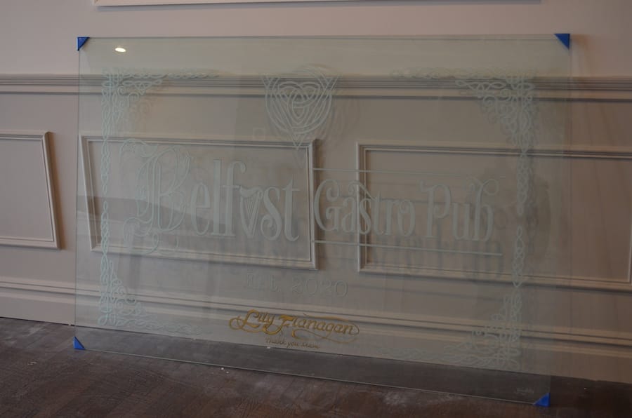 The catering hall and main dining area are separated by glass partitions both engraved with Irish symbols, such as the Claddagh, which is two hands holding a crowned heart symbolizing friendship and love.
