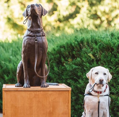 The bronze statue was made by sculptor Susan Bahary, who specializes in creating statues that honor service dogs and capture the bond between humans and animals