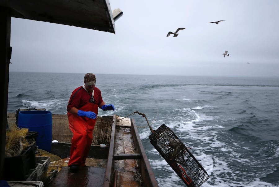 Top: In this May 2, 2016, photo, Bobby Kent pushes a baited lobster pot into the waters of Long Island Sound off Groton, Conn. Only a handful of lobstermen still work the waters due to a dwindling lobster population. Federal funding has been approved to begin removing some of the hundreds of thousands of derelict lobster pots left behind on the floor of Long Island Sound, a “ghost fishery” that continues to trap and kill marine life to this day. (AP Photo/Robert F. Bukaty, File)