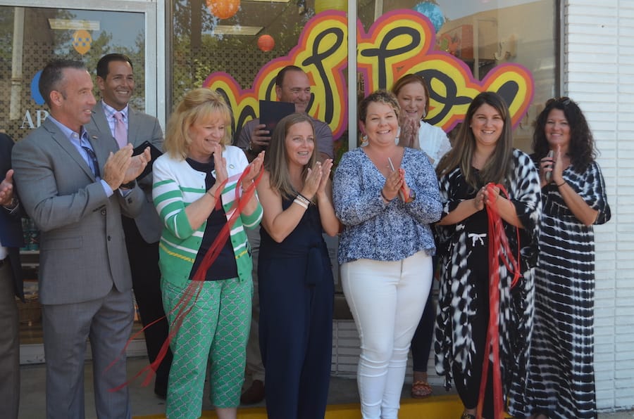 Owners Madeline Lunz, Teresa Striker, and Amber McCullough cut the red ribbon alongside village, state, county and town officials today, Friday, signifying its ceremonial opening at 10 Grove Place.