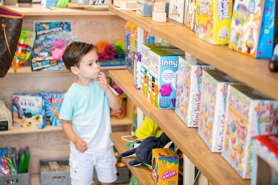 Top: Little boy finding the perfect toy in Argyle Toys in Babylon Village, officially open for business.
