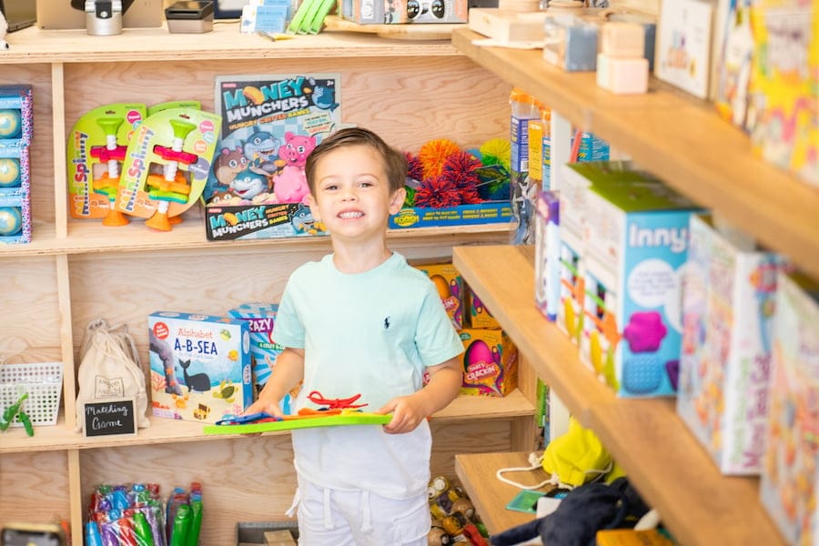 Top: Little boy finding the perfect toy in Argyle Toys in Babylon Village, officially open for business.