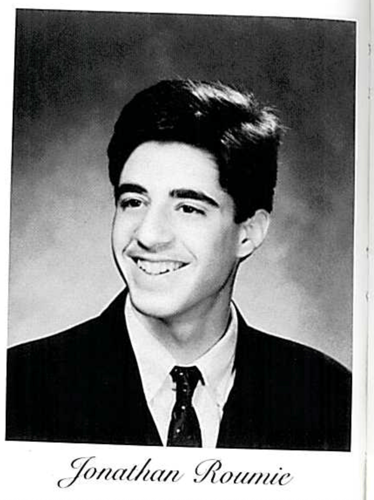 Top: Jonathan Roumie attends the premiere of “Solo Mio” at Regal Times Square on Tuesday, Jan. 27, 2026, in New York. (Photo by CJ Rivera/Invision/AP) Inset: Jonathan Roumie’s senior portrait in the 1992 Plainedge High School yearbook.
