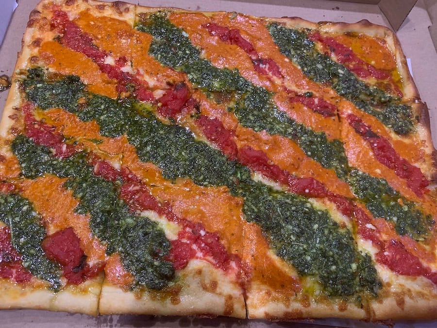 Other Pazza dishes include cheeseburger slices, brownie pizzas, and the Tri-Pie, which is a pizza with three sauces on it: marinara, vodka and pesto.