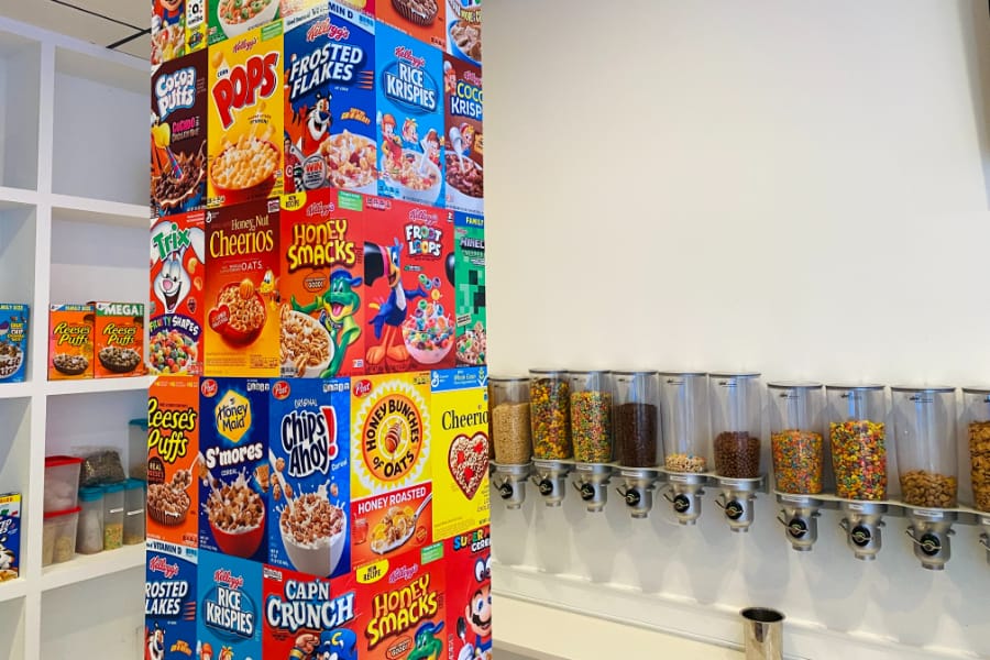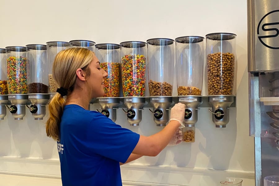 Customers pick their ice cream flavors, choose from nearly 20 cereal options including Lucky Charms, Reese’s Puffs and Fruity Pebbles, add toppings like fruits and candies and top it all off with a drizzled sauce.