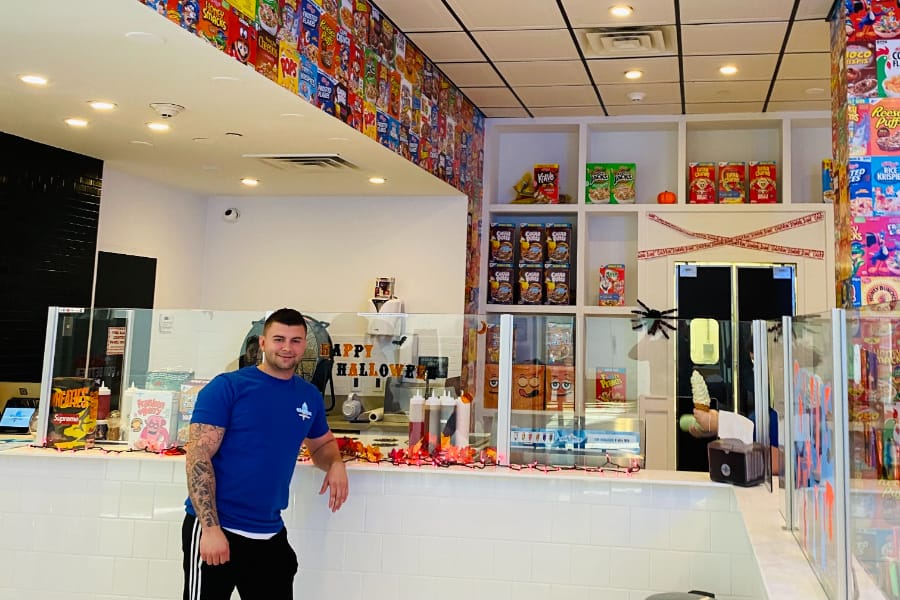 Steve Spahn new ice cream cereal bar, Blue Yeti, at the southwest food court entrance to the Smith Haven Mall, serves up classic sugary breakfast cereal injected into and/or served atop vanilla, chocolate and strawberry ice cream.