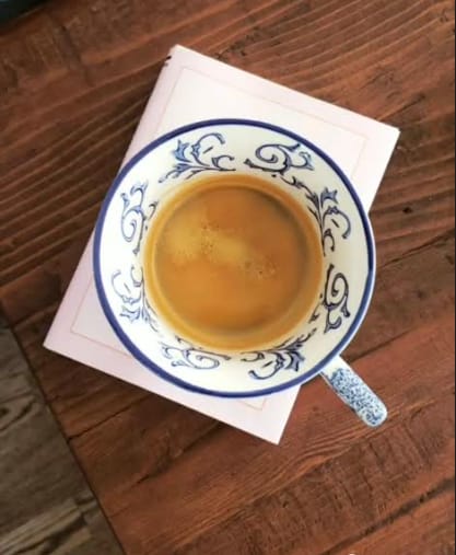 Step 4 is my personal favorite: espresso time. I get my bathrobe on, maybe even my cozy socks and march myself into the kitchen to make my Americano in one of my footed teacups (picking the right cup so important). I park myself in the chair in the window that faces the sunrise and I watch the magic in quiet as I think about the day. This little guy is Charles, my favorite footed tea cup: