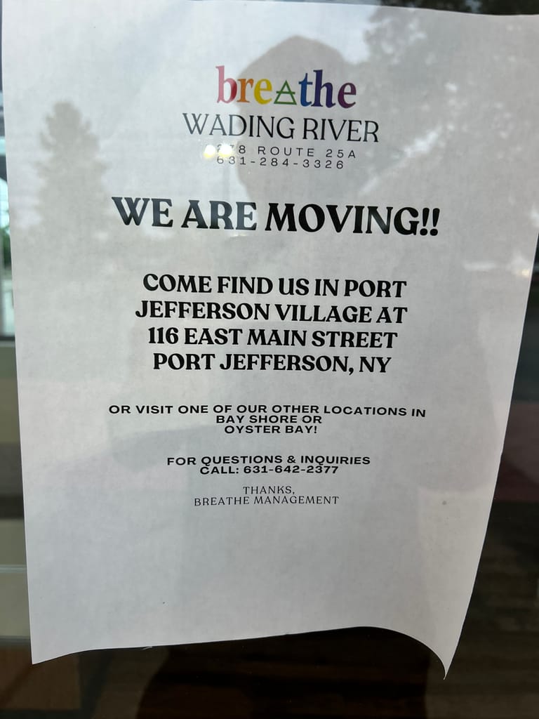 Management has a sign posted on the Wading River storefront with notification of the move to the store at 115 E. Main Street in Port Jefferson, and store display cases are listed for sale on the business’ Facebook page.