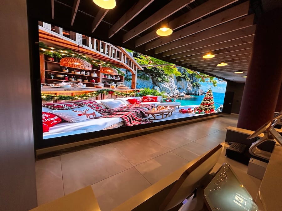 A 40-foot-wide LED screen — blazing with vivid psychedelic imagery, a Christmas scene, football game, Netflix movie, you name it — anchors one wall, while cascading crystal chandeliers overhead provide striking lighting.