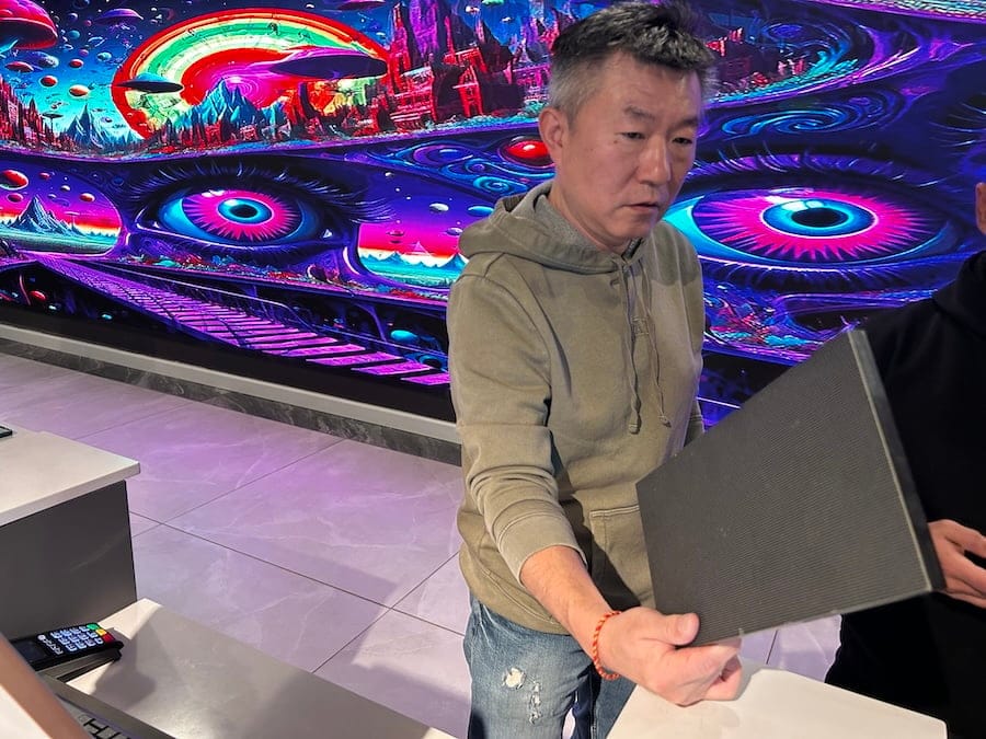 The LED wall, installed panel by panel — 300 individual pieces in all — was put together by family friend Wilson Li. Its kaleidoscopic visuals shift throughout the day, on Monday bathing the showroom in ever-changing hues of neon pink, electric blue and vivid orange.