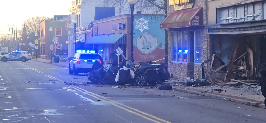A sedan plowed into multiple downtown Patchogue businesses Monday morning, virtually destroying a closed shoe store and heavily damaging a Chinese restaurant. The impact was so severe that the car’s roof was torn off, leaving debris scattered across the street.