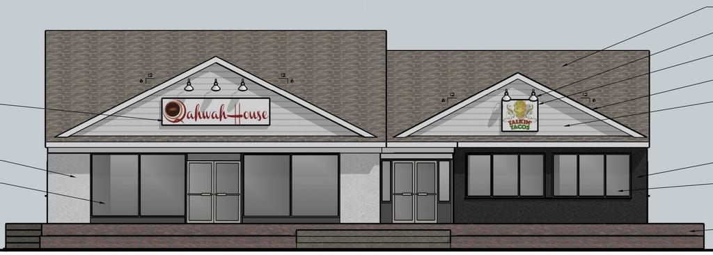 Top: Existing Qahwah House and Talkin’ Tacos storefronts (Facebook).