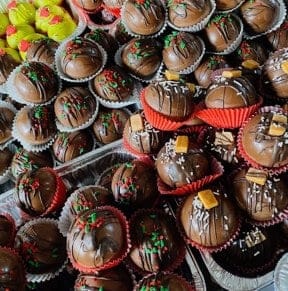 The chocolate shop offers milk cocoa, dark cocoa, white cocoa bombs, and a yeti bomb with white cocoa powder with marshmallows and white chocolate.