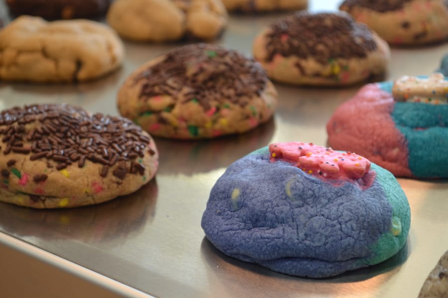 A variety of big-stuff cookies line the shelves, like PB&J, s’mores, cookies and cream, and the “Bada Bing” which is an almond-infused dough with pink, yellow, and green sprinkles mixed in, then stuffed with raspberry preserves and an Italian rainbow cookie.