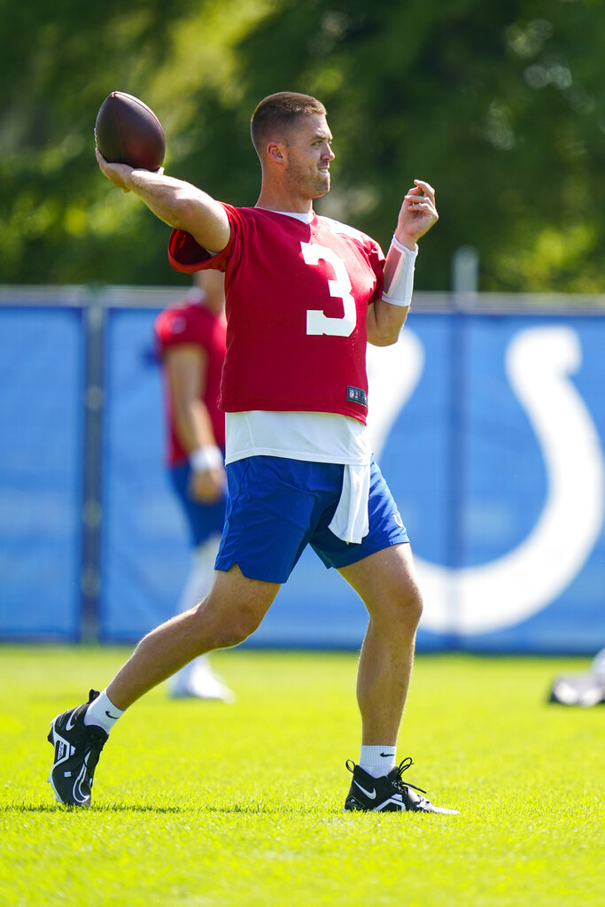 Indianapolis Colts quarterback Jack Coan (3) throws during practice at the NFL team’s football training camp in Westfield, Ind., Thursday, Aug. 4, 2022. (AP Photo/Michael Conroy)