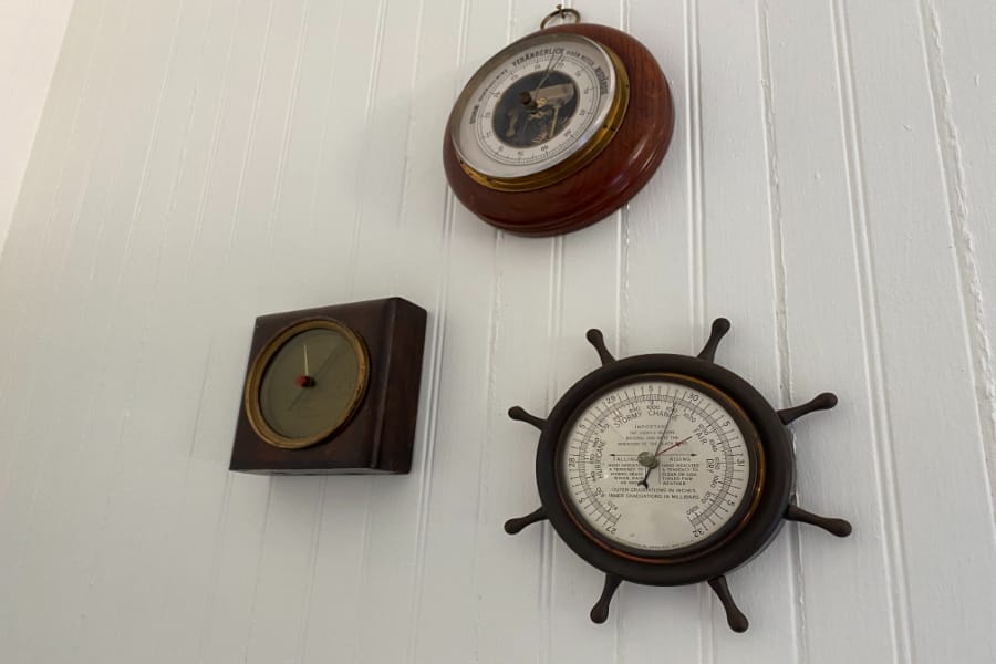 Antiques adorn walls throughout the house and the cottage, from fishing exposition buttons to bowling trophies, and old barometers and thermometers to a porthole mirror, all of which were either on the property or sourced from the village.