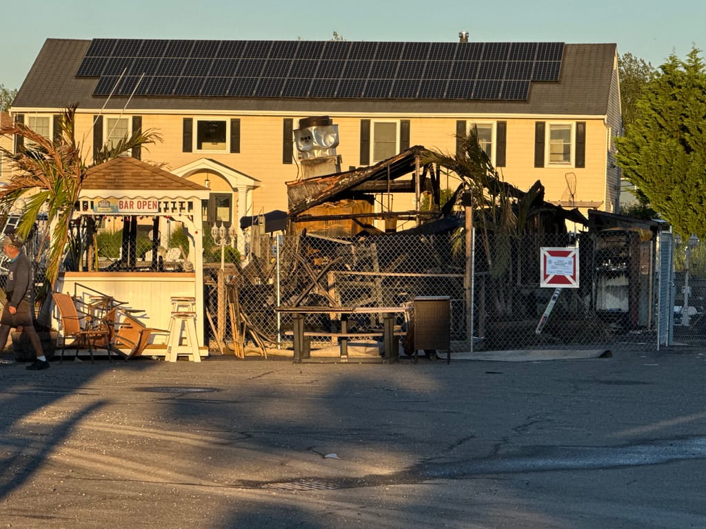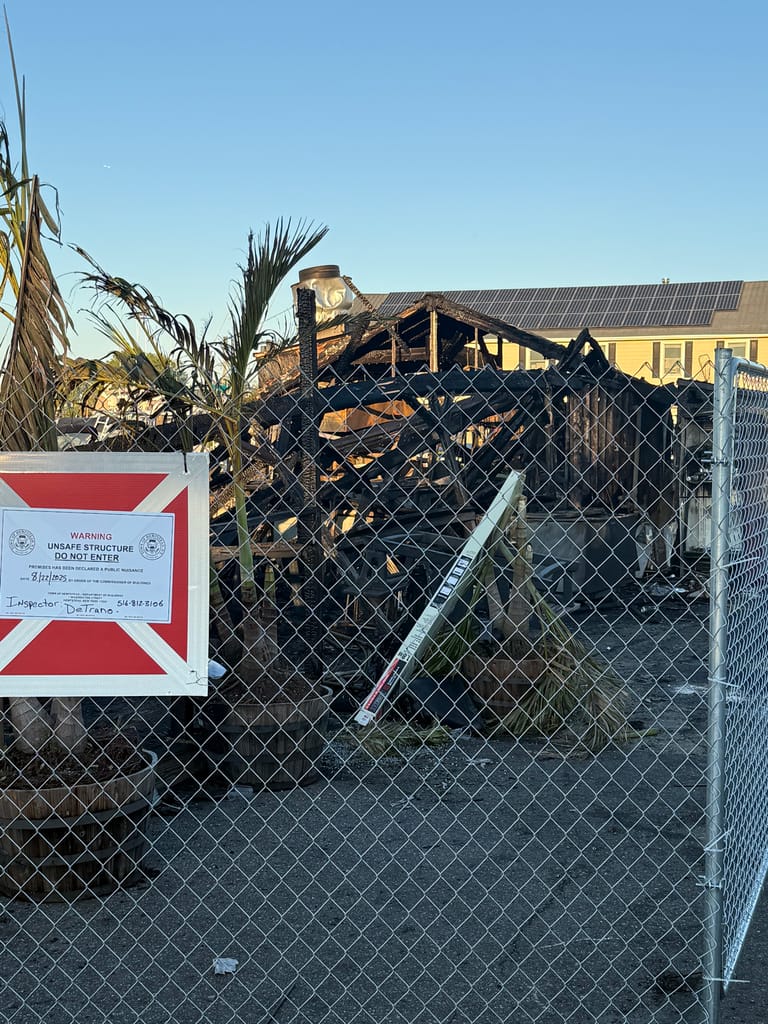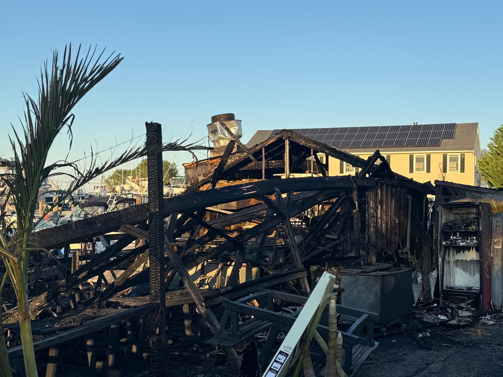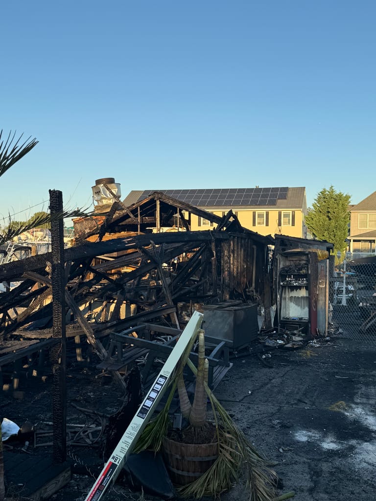 Greater Long Island was on the scene capturing photos of the destruction. The damage is stark: the once-bustling eatery is now a blackened shell, with boats scorched in the slips beside it, still tied to moorings.