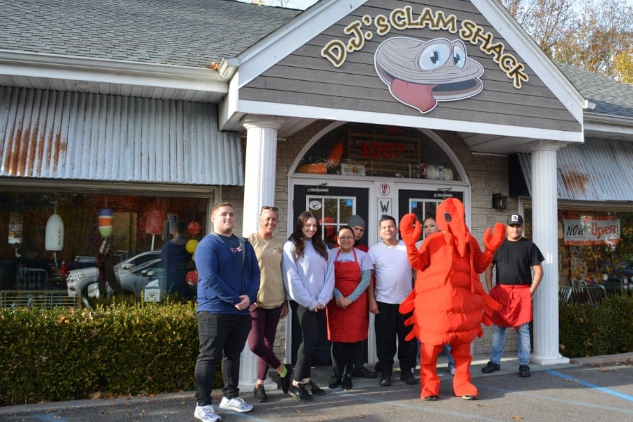 Top: D.J.’s Clam Shack Stony Brook staff with Paul Riggiao, sporting a lobster suit