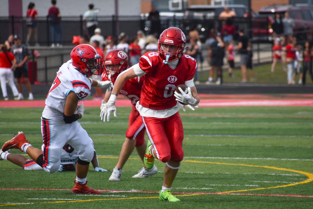 East Islip’s undefeated varsity squad unleashed a punishing ground game, building a commanding 34-7 halftime lead. East Islip piled on 27 more points in the second half for a lopsided 61-21 victory, with Jake Simmons rushing for 231 yards and three touchdowns. Will Gonzalez and Andrew Arena added 76 and 59 yards respectively, each scoring a touchdown.