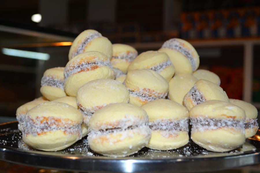 The shop also sells fresh baked sweets, such as croissants and bolas de fraile, which are akin to a doughnut. The alfajores de maicena, soft sandwich cookies filled with dulce de leche and rolled in coconut, draw customers’ eyes from the case atop the front counter.