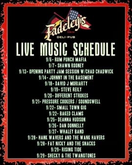 Rum Punch Mafia performs later on Friday and Shawn Rooney takes the stage on Saturday. Check out the remainder of Fadeley’s September live music schedule below.