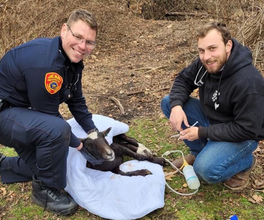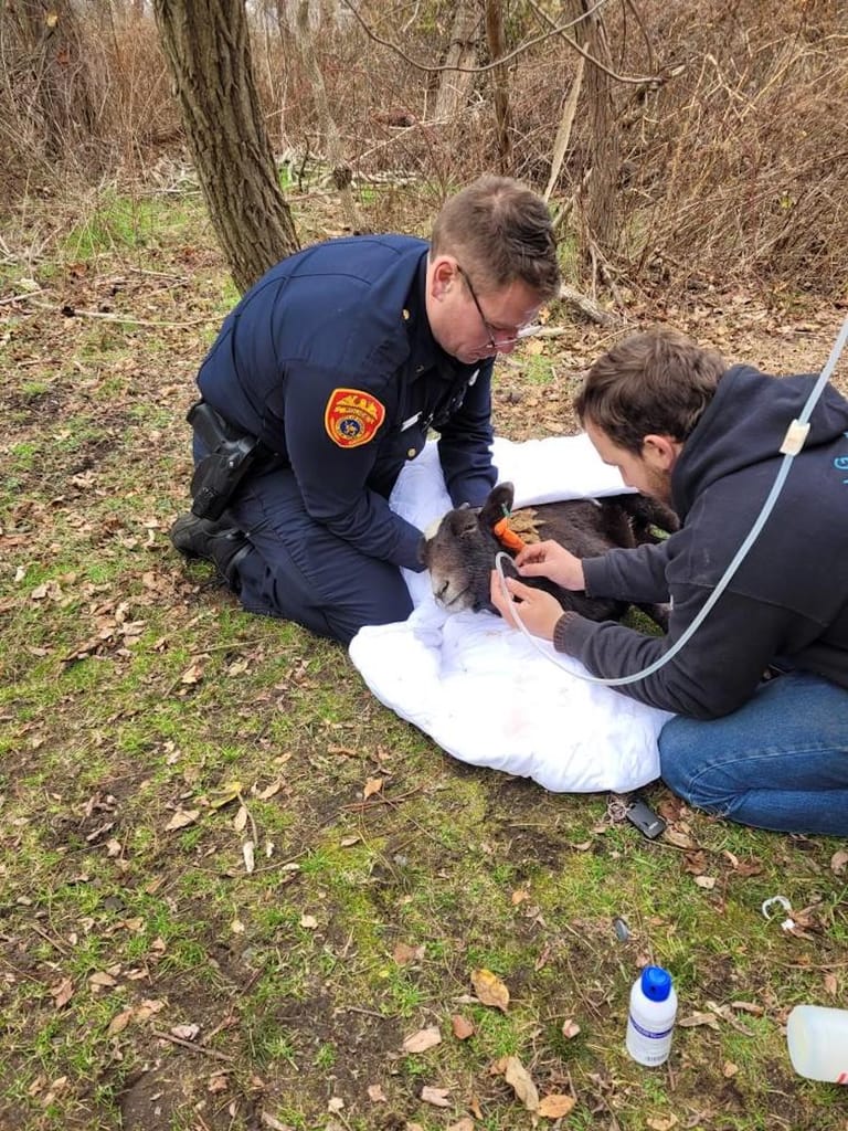 Officers Doug Draude and Samantha Thompson, along with veterinarian Dr. Benjamin Haar, provided emergency care to rescue the animal. The sheep was promptly transported to a local animal sanctuary for what we can only assume will be some serious therapy and, of course, medical treatment.