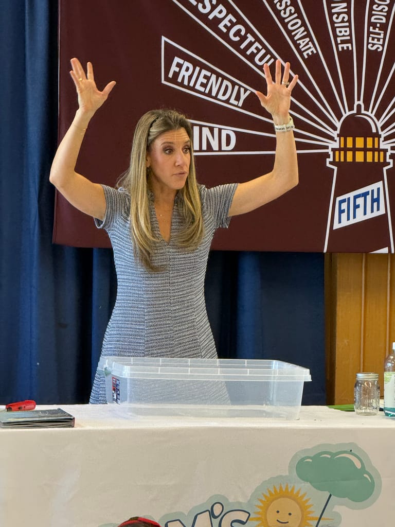 “The props are so important. I love to get the kids involved,” Augeri said with a smile Thursday at Fifth Avenue Elementary School in Bay Shore. “The more fun they’re having, the more fun I’m having.”