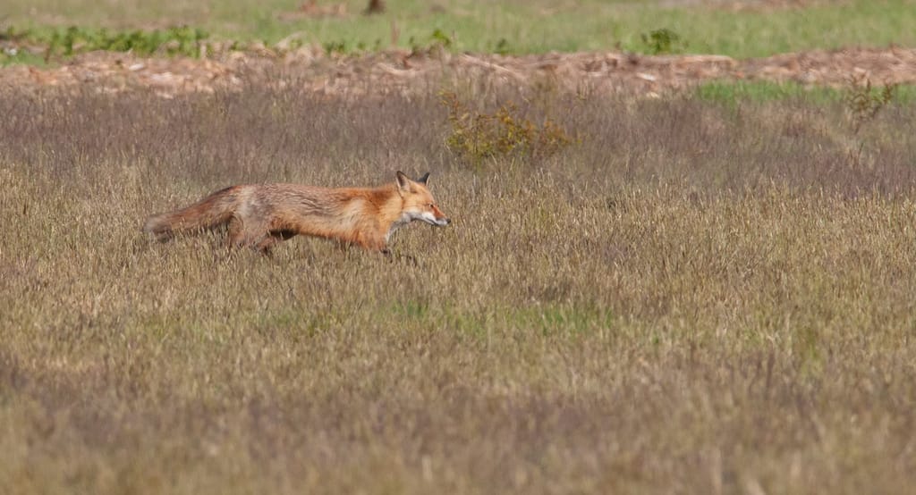 Also, red foxes’ hind limbs are longer in proportion to their front limbs, though this also might also be hard to notice from afar.